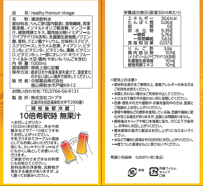 原材料名:りんご酢(圏内製造)、食物繊維、高果糖液糖、イソマルトオリゴ糖液糖、マンゴー果汁、植物発酵エキス、鶏肉抱出物(イミダゾールジペプチド15%含有)、乳酸菌生産物質/ク工ン酸、香料、ク工ン酸ナトリウム、甘味料(ステピア、スクラローストカラメル色素、ナイアシン、ビタミンB2、ビ、タミンB1、ビタミンB6、葉酸、ビタミンD、ビタミンB12、(一部にオレンジ・キウイフルーツ・くるみ・大Re鶏肉・やまいも・りんごを含む)